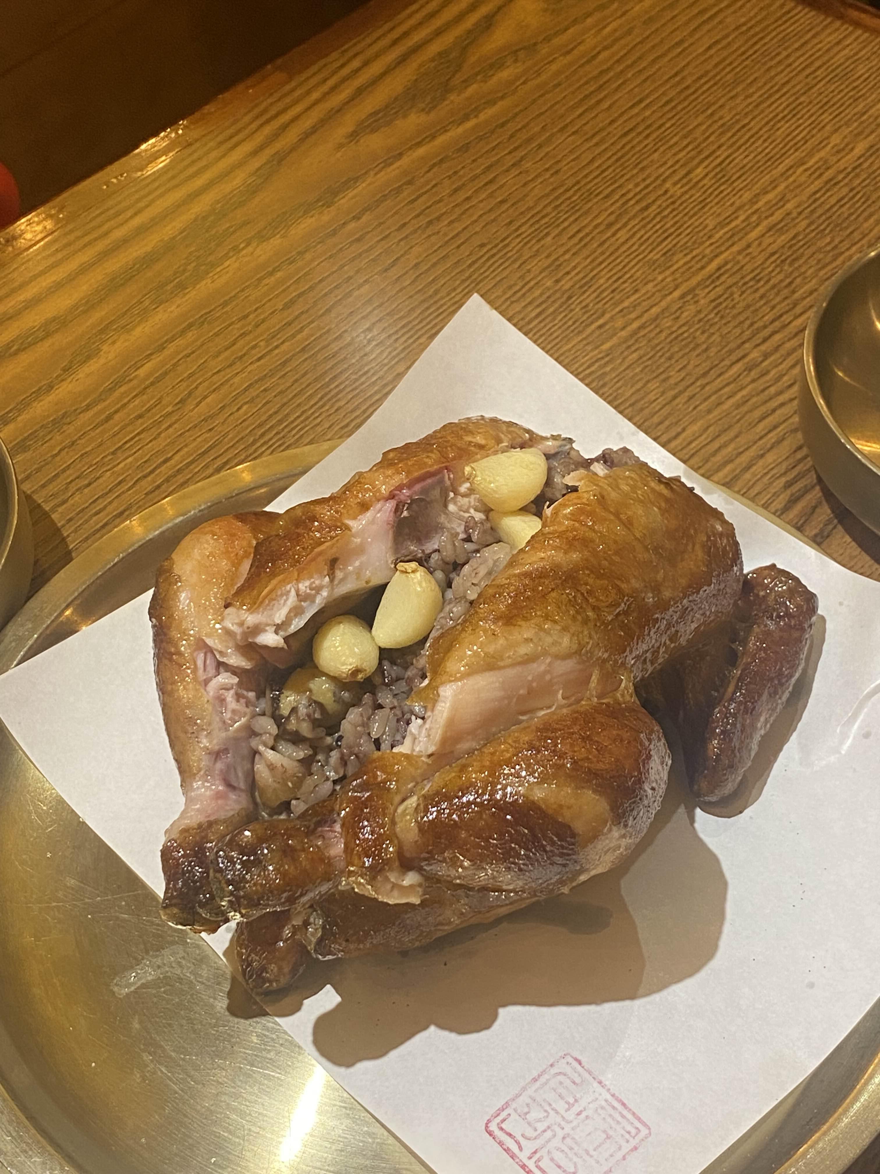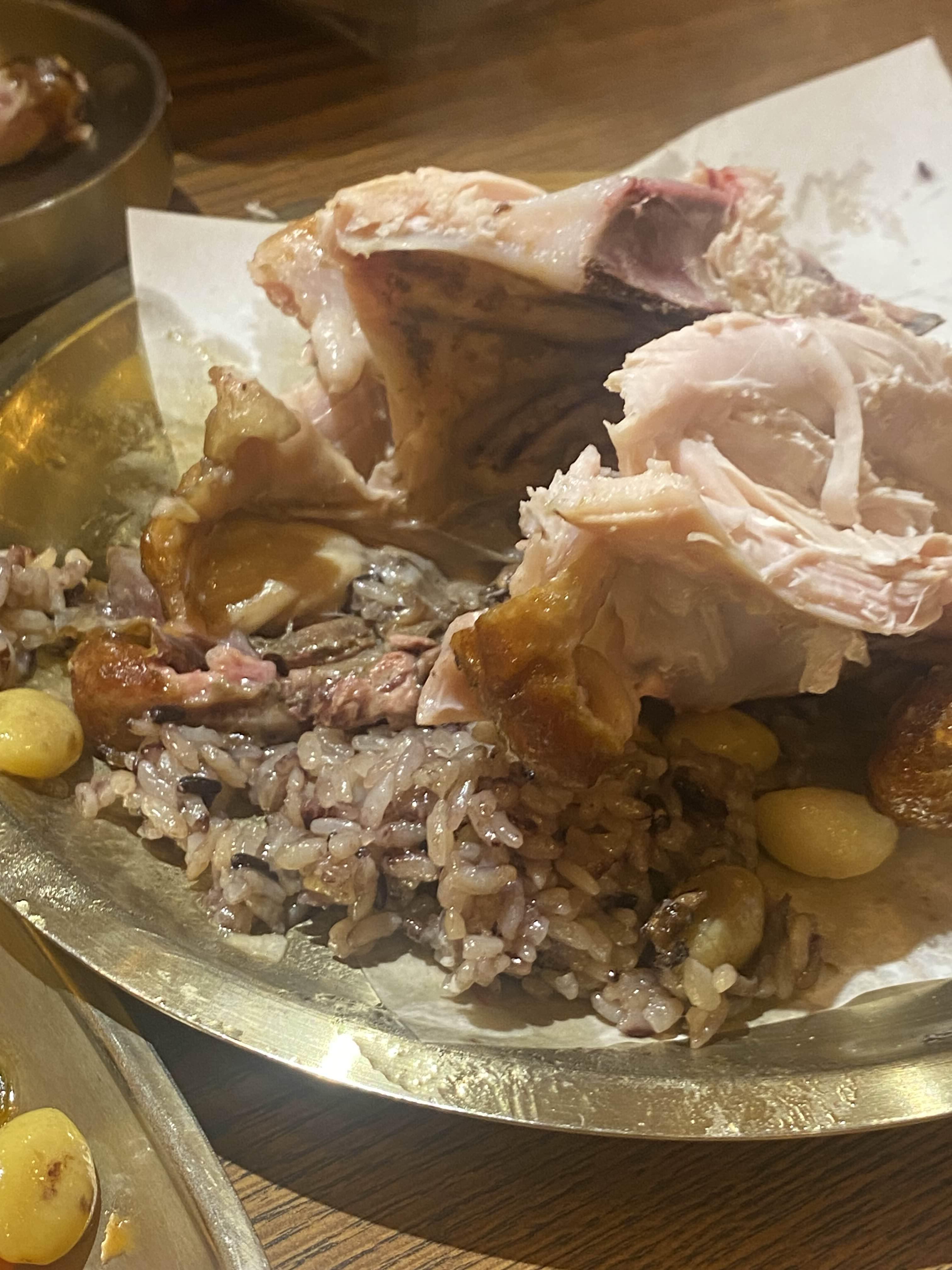 안에 밥과 마늘 은행 능이 등으로 속이 차 있어요.