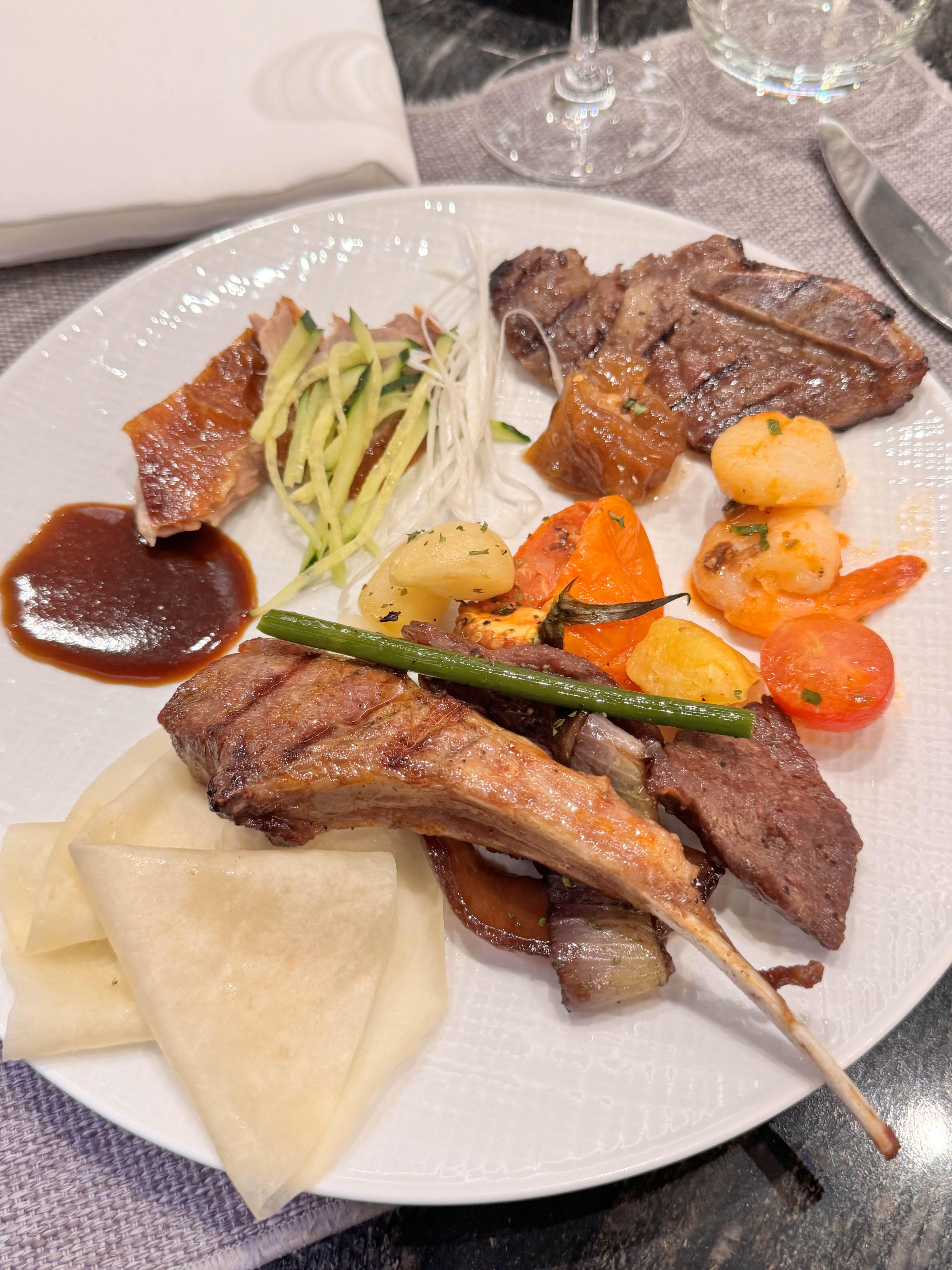 북경오리 양갈비 부채살 LA갈비와 해산물과 가니쉬